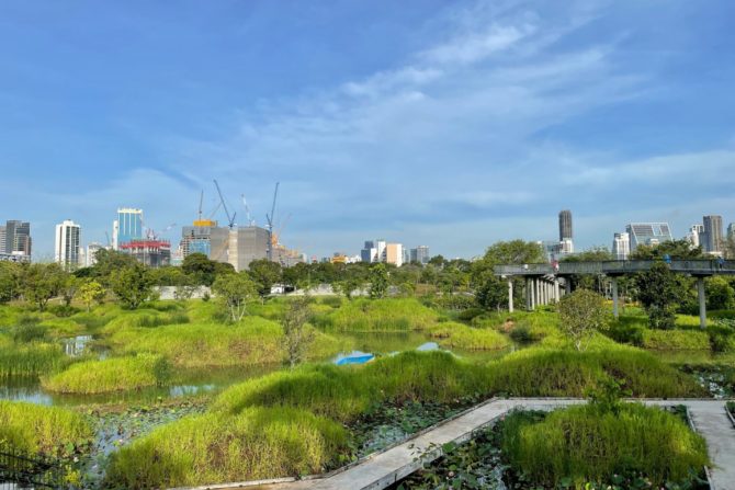 バンコクのBTSアソーク駅から近い巨大な人工池があるベンジャキティ公園。その公園の奥に2022年2月から新しい森林公園がオープンしたと聞き朝から行ってきました。公園内は長いスカイウォークが張り巡らされ、綺麗な植物が植えられ、さわやかな散歩を満喫できました。