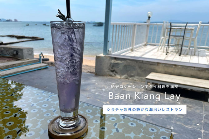 シラチャの北部、海がすぐ目の前の絶好ロケーションでおいしいタイ料理をいただきました。乾季に入ってからの海は陸からでもとてもきれいでした。バタフライピーの氷にライムを注ぐジュースが飲みたかったのですが、準備がないとのこと。残念。